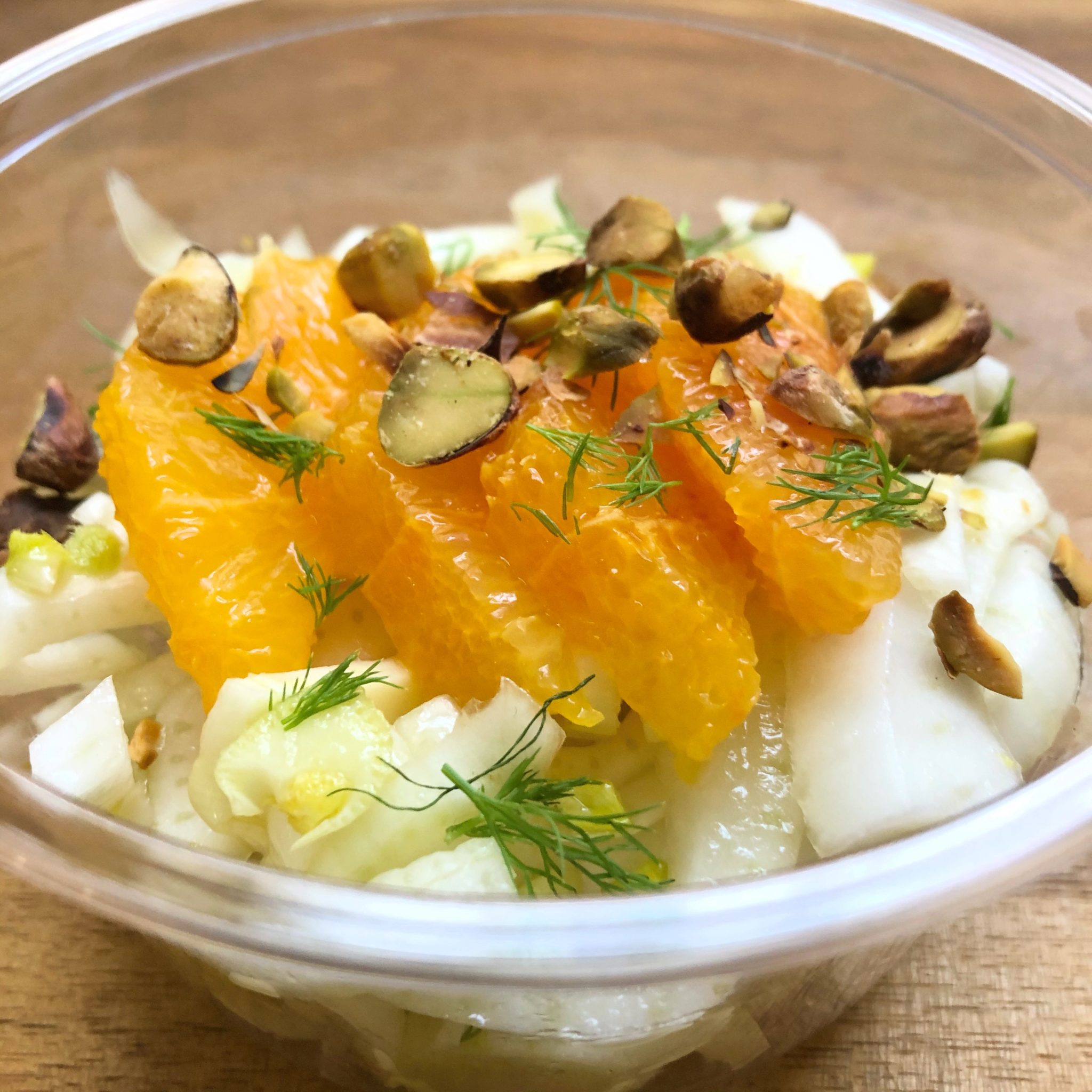 Crudo di finocchi, con arance e pistacchi bio tostati. Un must sfizioso e leggero. Già condita. Da conservare in frigo e mangiare in giornata.
