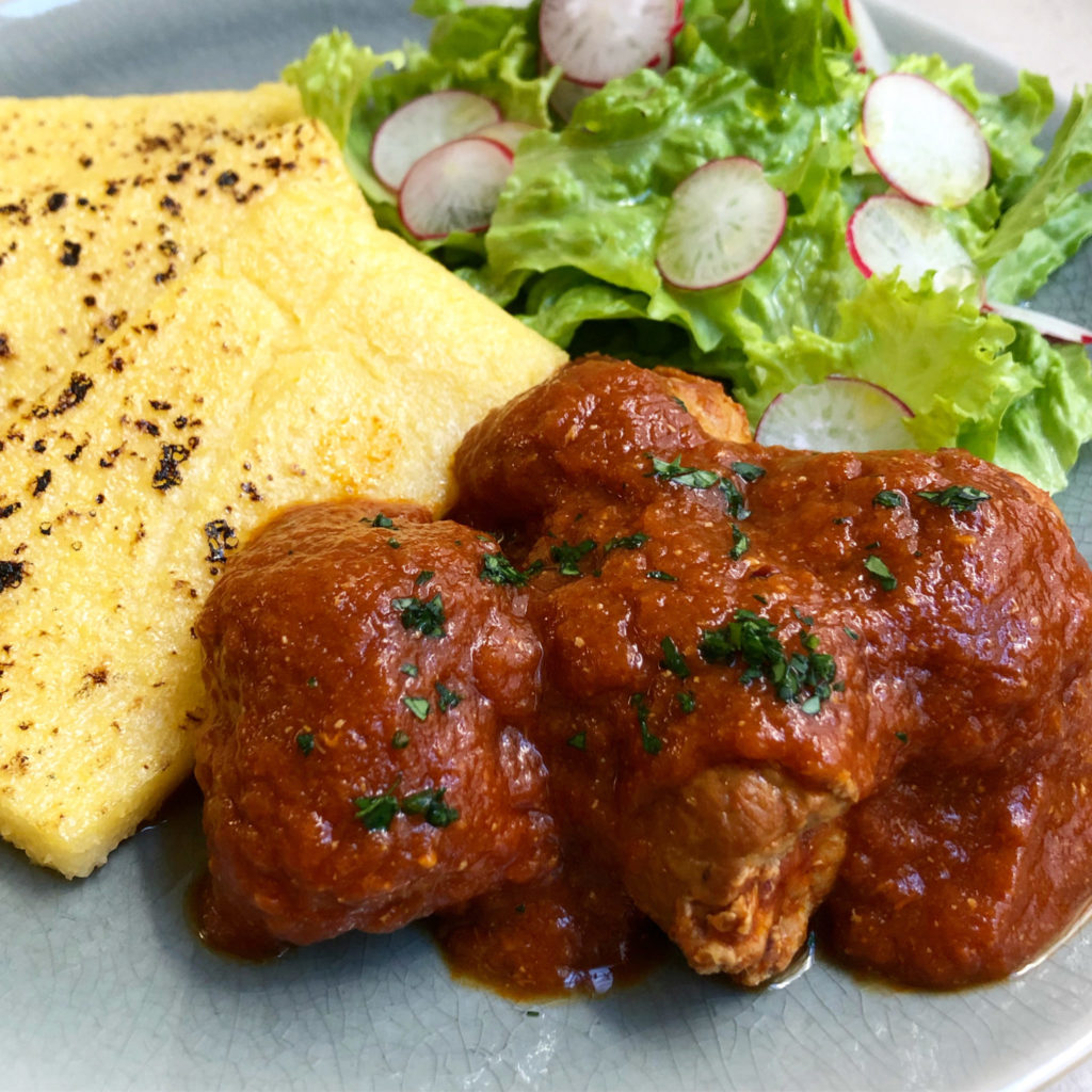 Con carne di maiale dell’Az. Agricola Nava ripiena di bacon, ricotta affumicata e prezzemolo. Il tutto cotto lentamente nel sugo di pomodoro. Polenta grigliata e insalatina completano un piatto ricco e sostanzioso, perfetto per “crescere bene”, come la nonna vorrebbe!