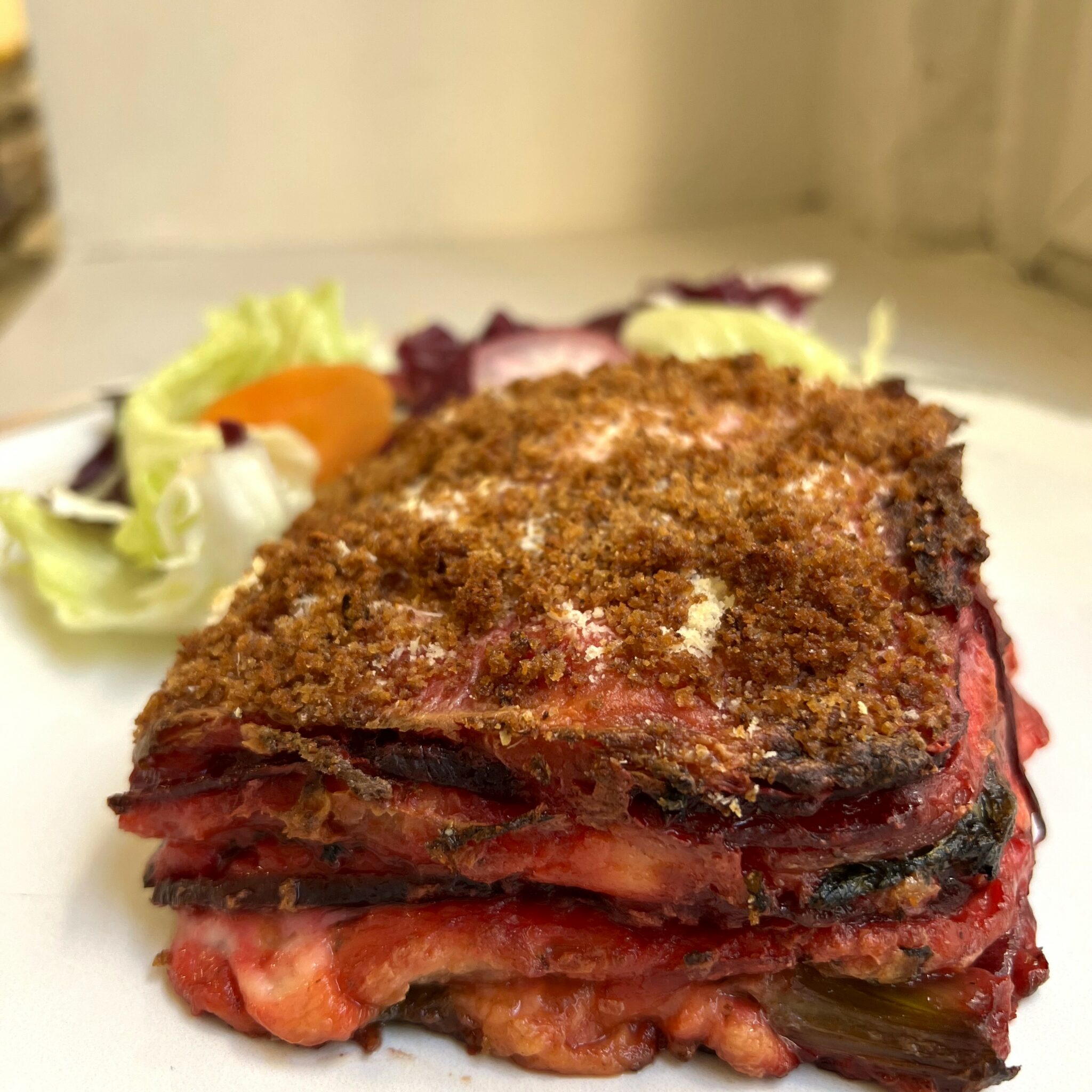 Direttamente dal sottosuolo invernale, barbabietole, patate e cime di rapa in una millefoglie che alterna gli ortaggi a mozzarella artigianale del caseificio “Il centro della mozzarella” e besciamella. Il tutto gratinato in forno con pangrattato e accompagnato dalla nostra insalata fresca. Golositá all’ennesima potenza!